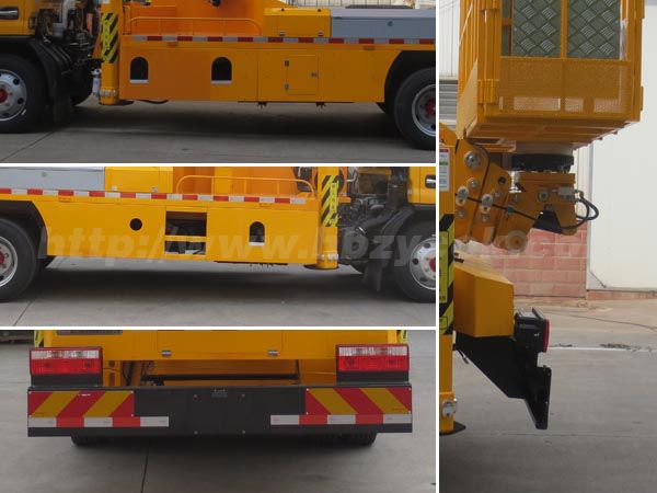 后伸:330mm;隨底盤選裝駕駛室,選裝限速裝置時最高車速為:89km/h;側(cè)面防護(hù)裝置材料材質(zhì):Q235,整體式結(jié)構(gòu);后下部防護(hù)裝置材料材質(zhì):Q235,連接方式:螺栓連接,斷面尺寸(寬×高):50×260(mm),離地高度:475mm;ABS型號/廠家:ABS型號:ABS/ASR-24V-4S/4M,廠家:襄陽東風(fēng)隆誠機(jī)械有限責(zé)任公司;主要專用裝置為伸縮臂,用于搶修電力、通訊、路燈等高空作業(yè)。支腿和臂架上的警示燈僅在車輛作業(yè)狀態(tài)下使用。 | |||